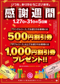 シングルコースで500円割引券、ダブルコース以上で1,000円割引券をプレゼント。
